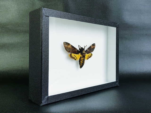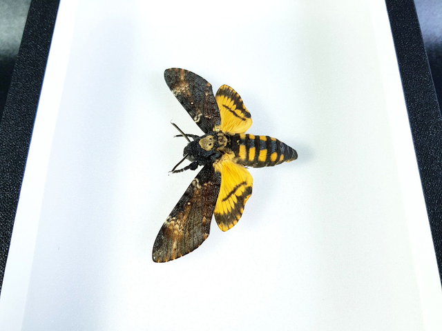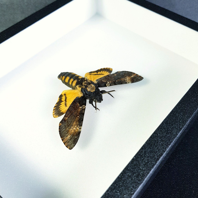 Lépidoptère de la famille des Sphingidae originaire d'Europe piqué dans un cadre à fond émalène blanc sous verre. Il s'agit du plus beau sphinx "tête de mort" parmi le genre Acherontia, spécimens de grande taille et aux couleurs marquées.