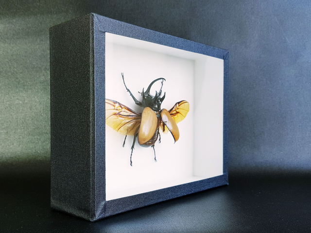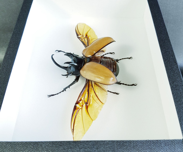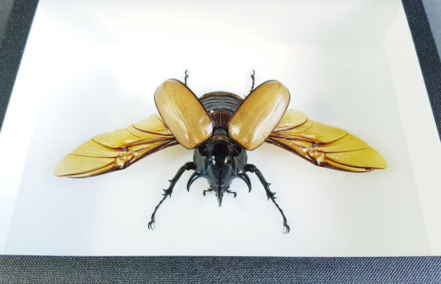 Coléoptère de la famille des Scarabaeidae (Dynastinae) originaire de Thaïlande piqué dans un cadre à fond émalène blanc sous verre.