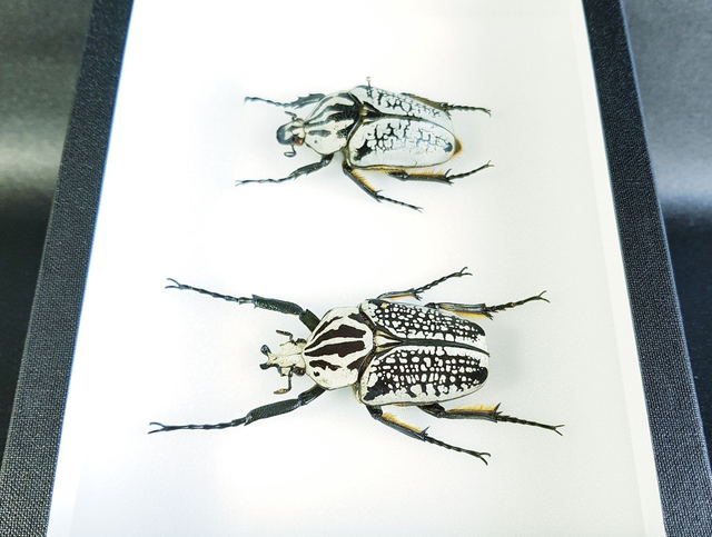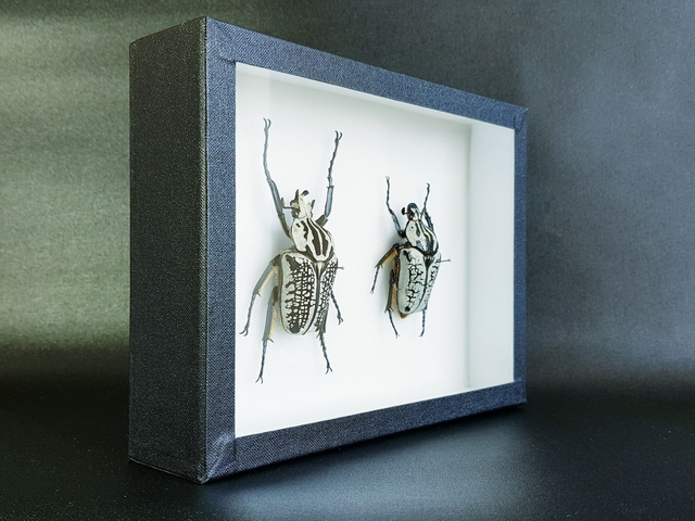 Couple de coléoptères de la famille des Scarabaeidae (Cetoniinae) originaire de République Démocratique du Congo piqué dans un cadre à fond émalène blanc sous verre.