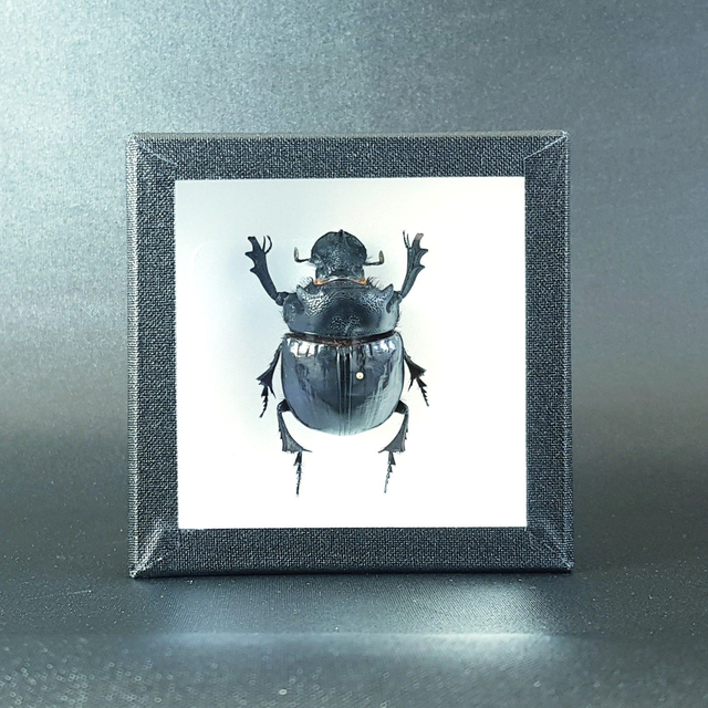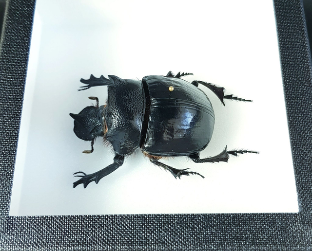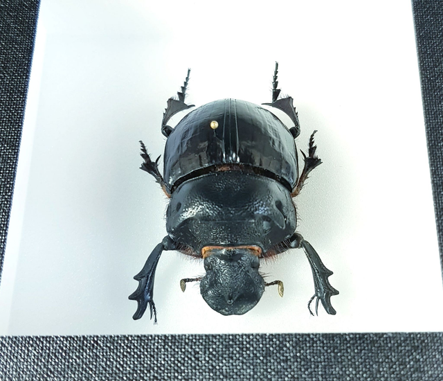 Coléoptère de la famille des Scarabaeidae (Scarabaeinae) originaire d'Indonésie piqué dans un petit cadre à fond émalène blanc.