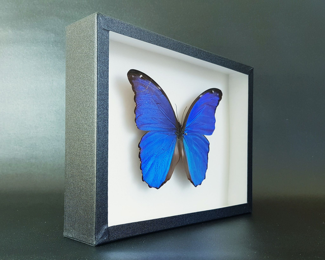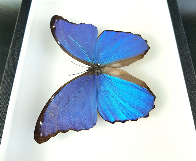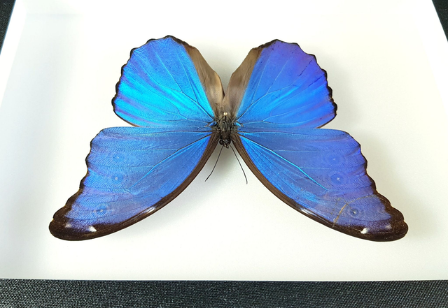 Grand Lépidoptère de la famille des Nymphalidae (Morphinae) originaire du Pérou piqué dans un cadre à fond émalène blanc sous verre.