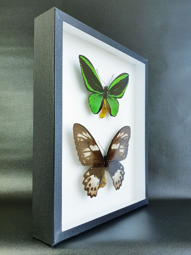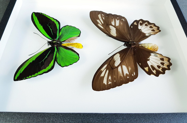 Couple de lépidoptère de la famille des Papilionidae originaires d'Indonésie piqués dans un cadre à fond émalène blanc sous verre.