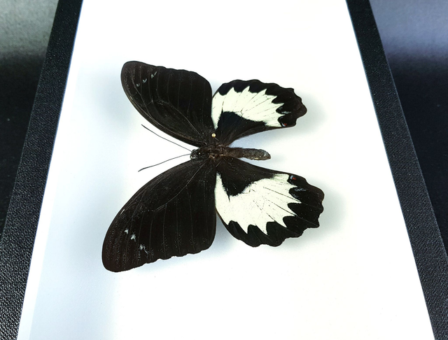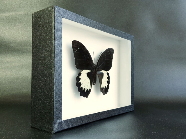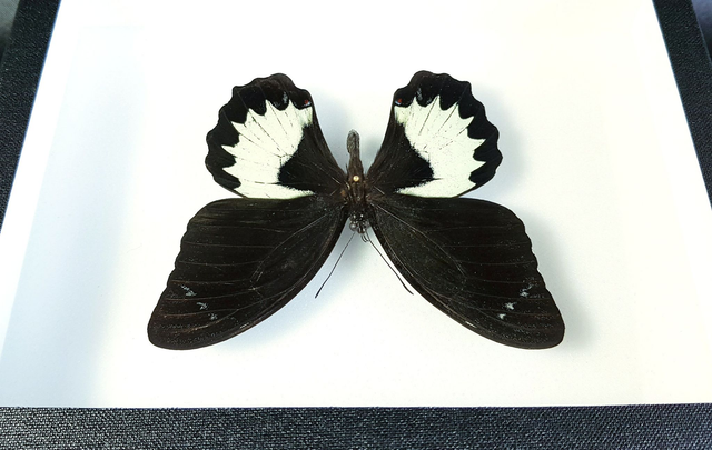 Lépidoptère de la famille des Papilionidae originaire d'Indonésie piqué dans un cadre à fond émalène blanc sous verre.