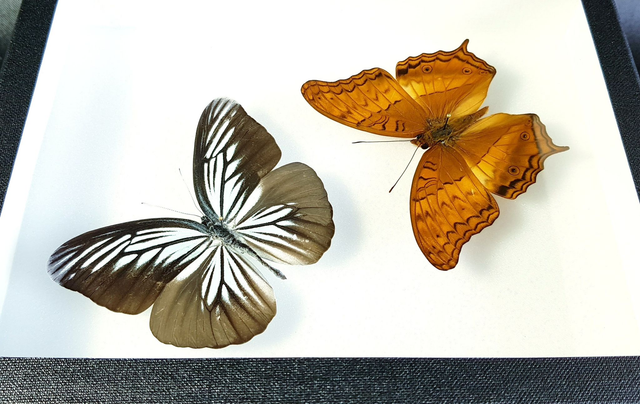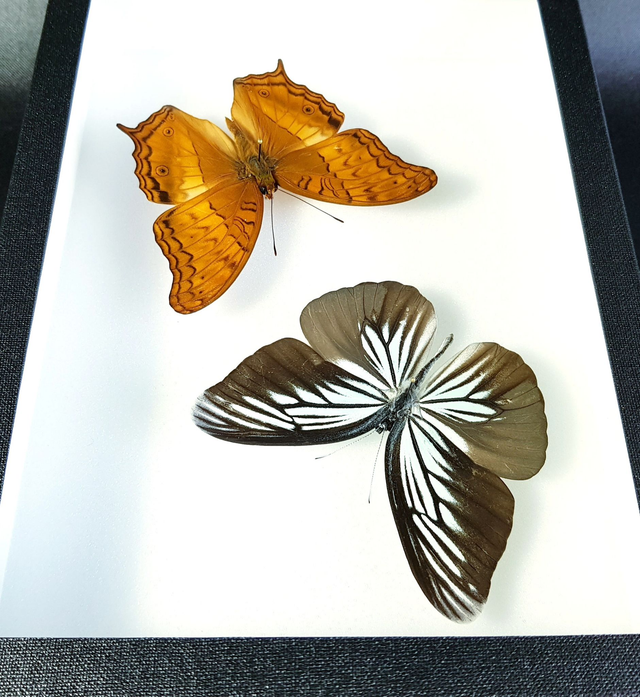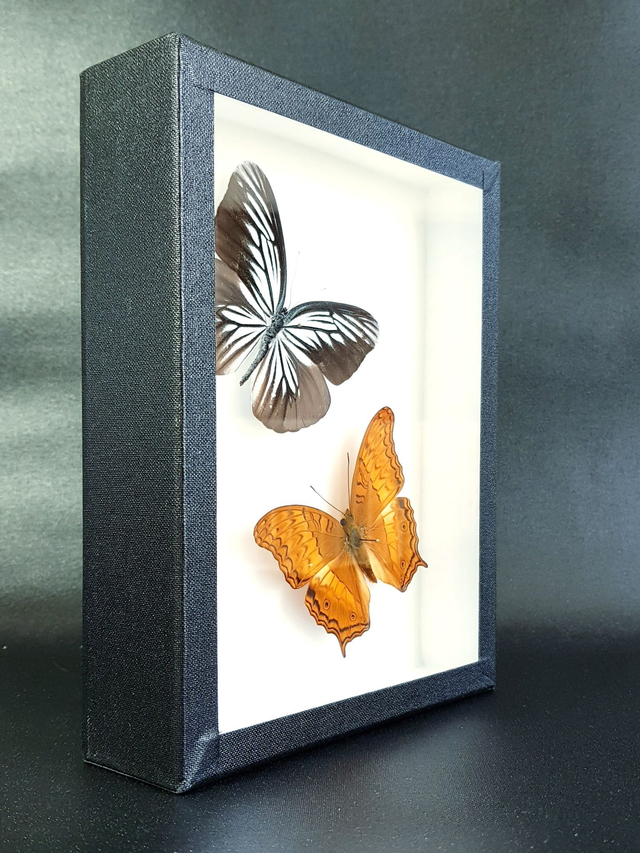Duo de lépidoptères des familles des Nymphalidae et des Pieridae originaires d'Indonésie piqués dans un cadre à fond émalène blanc sous verre.