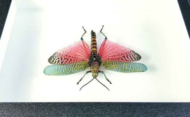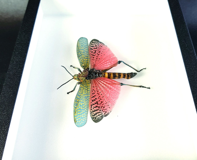 Une étiquette avec nom, classification et provenance de l’animal est fixée au dos du cadre.