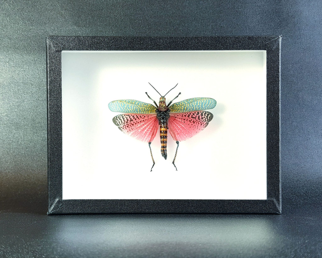Orthoptère de la famille des Pyrgomorphidae originaire de Madagascar piqué dans un cadre à fond émalène blanc.
