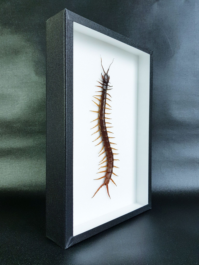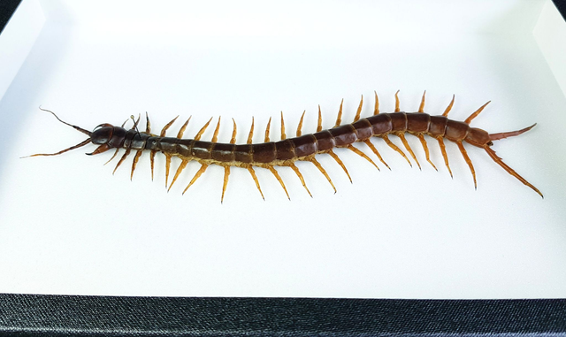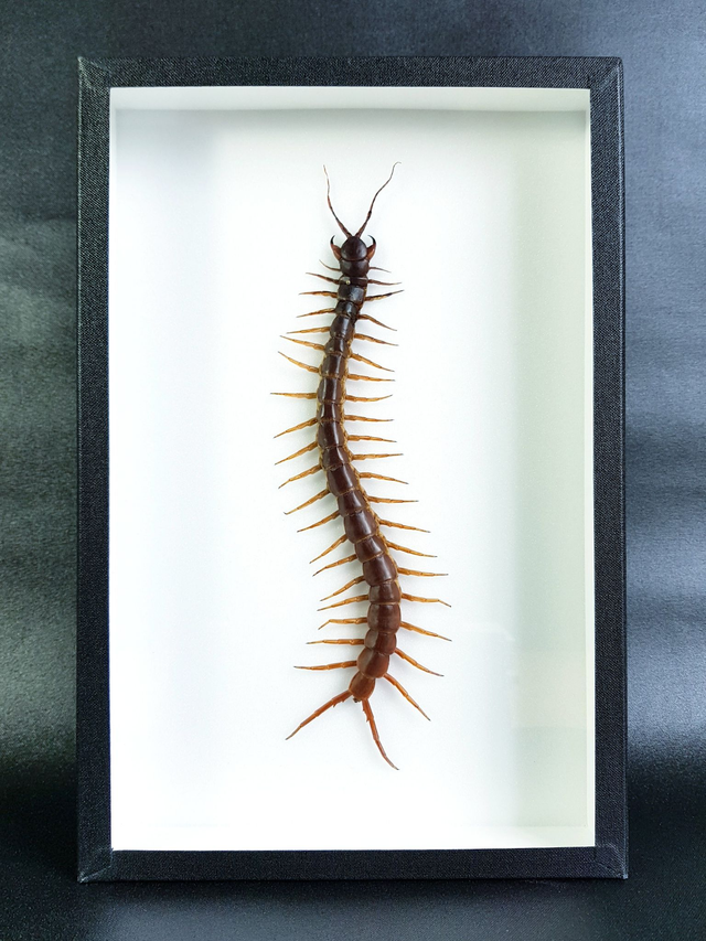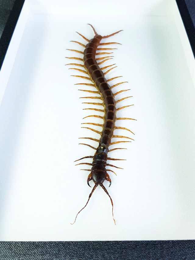 Scolopendre géant de la famille des Scolopendridae originaire de Thaïlande piqué dans un cadre à fond émalène blanc sous verre. Longueur du corps seul : 180-190mm.