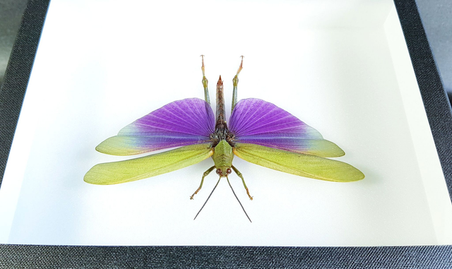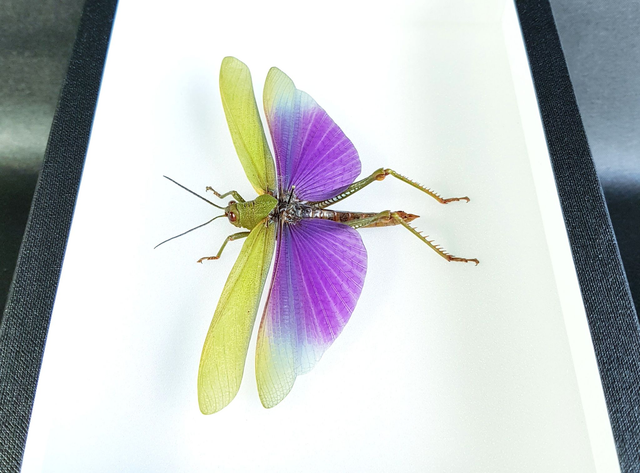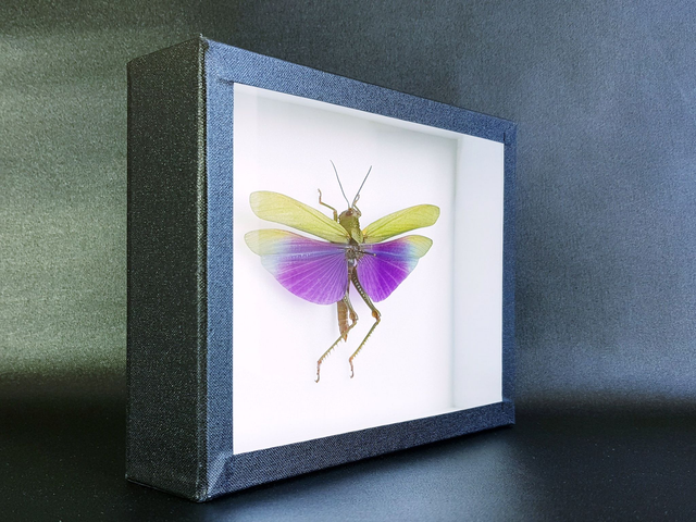 Orthoptère (criquet) de la famille des Romaleidae originaire de Guyane Française piqué dans un grand cadre à fond émalène blanc sous verre.