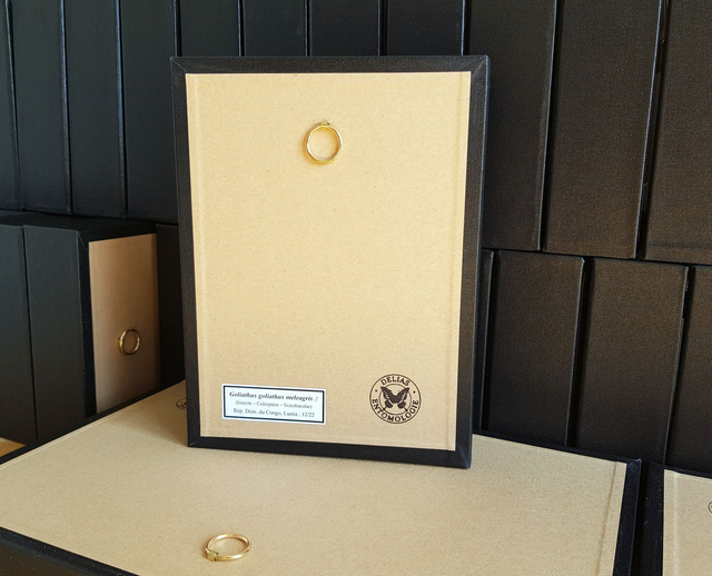 Une étiquette avec nom, classification et provenance de l’animal est fixée au dos du cadre.
