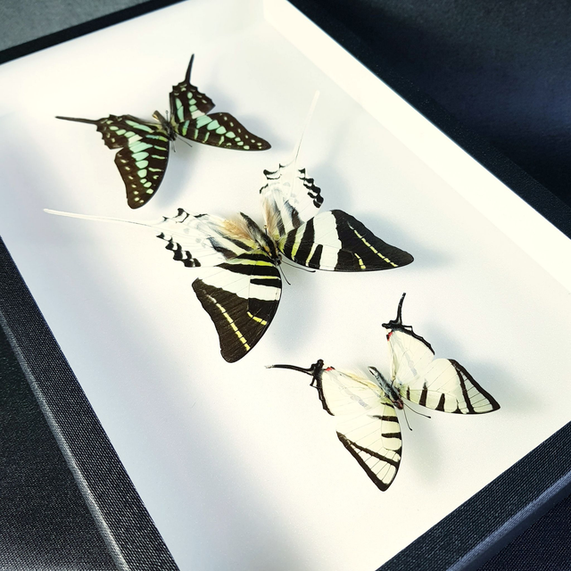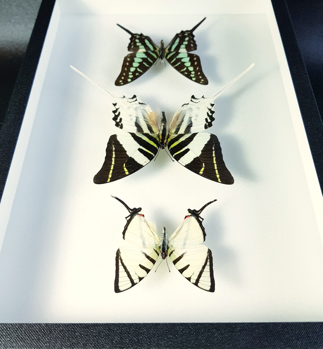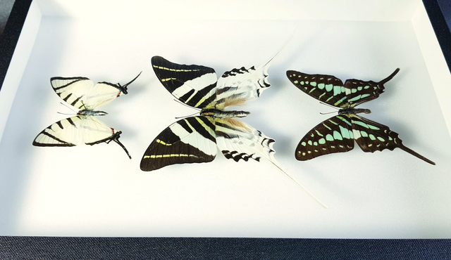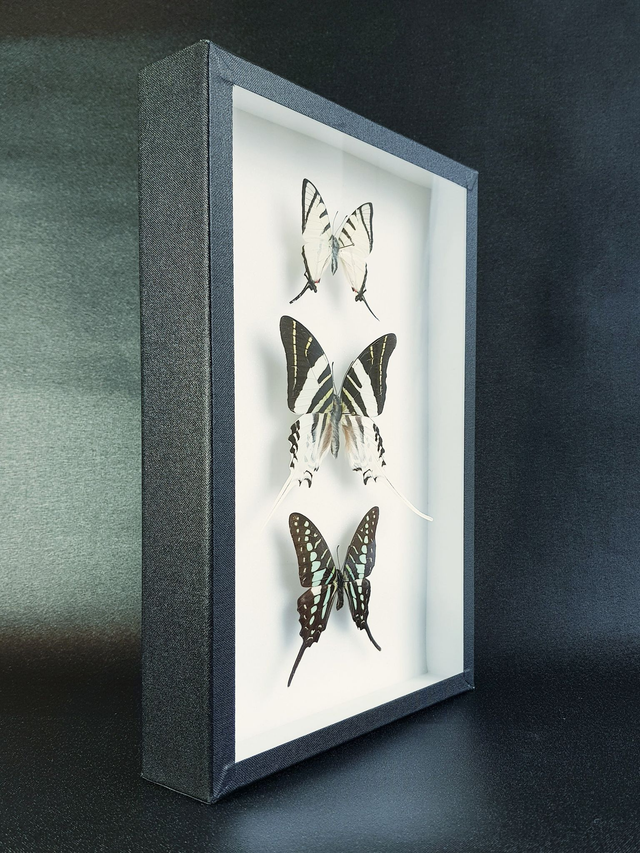 Lépidoptères de la famille des Papilionidae originaires de Malaisie, d'Indonésie et de Centrafrique piqués dans un cadre à fond émalène blanc sous verre.